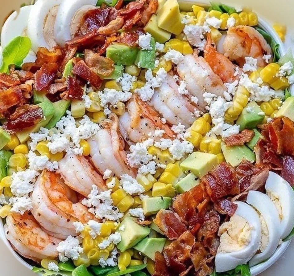 Une version marine et vitaminée du célèbre Cobb Salad ! Cette salade associe des crevettes tendres, de l’avocat crémeux, du bacon croustillant, des œufs durs, du maïs sucré et une vinaigrette au yaourt grec, citron et ciboulette. Parfaite pour un déjeuner frais, complet et plein de saveurs ! 🥗🍋