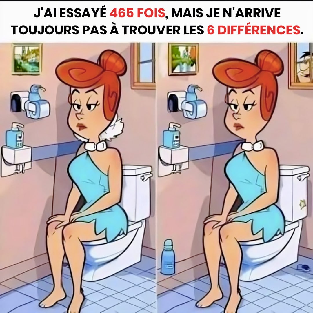 Dans cette épreuve, un personnage animé bien connu se trouve dans une salle de bain. À première vue, tout semble identique… mais six petits changements se cachent à l’intérieur de la scène. Saurez-vous les débusquer sans tricher ?