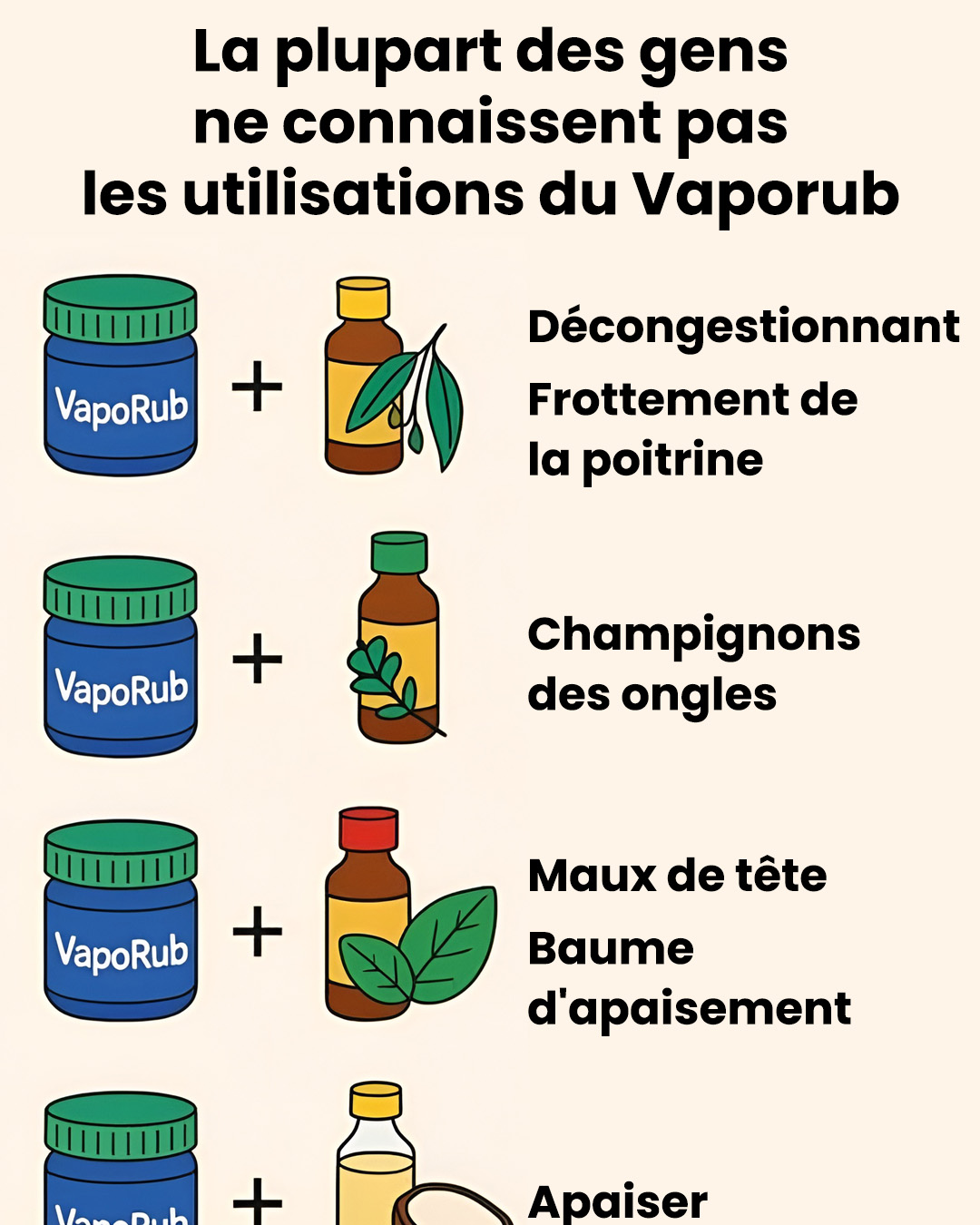 Le Vaporub est souvent associé aux rhumes et congestions. Mais saviez-vous que cette pommade à l’arôme mentholé a bien plus à offrir ? De l’apaisement musculaire aux soins de la peau, ce produit incontournable de nos armoires à pharmacie peut se révéler être un allié multifonction précieux. Découvrez comment l’utiliser autrement et profiter de ses bienfaits souvent méconnus !