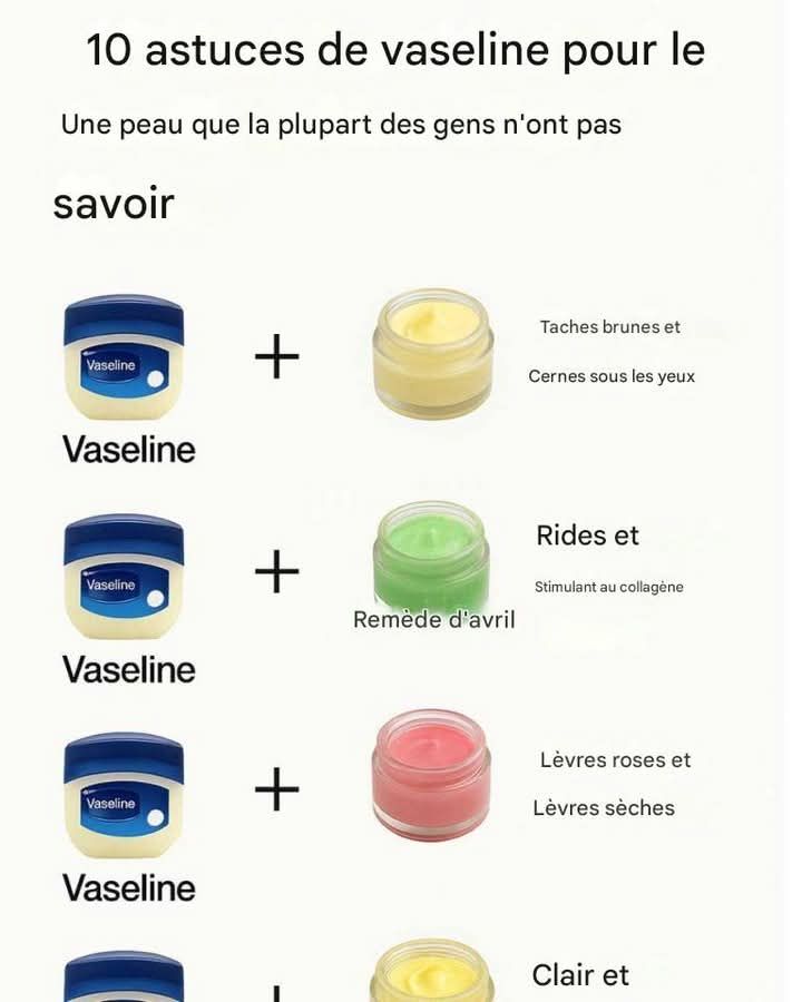 La vaseline, ce produit simple et bon marché, est souvent reléguée au rang de soin basique. Pourtant, elle cache bien des secrets pour prendre soin de votre peau au quotidien. Que ce soit pour hydrater, protéger ou même sublimer votre peau, la vaseline est un allié beauté surprenant que beaucoup sous-estiment. Découvrez 10 astuces efficaces avec de la vaseline, que la plupart des gens ignorent !