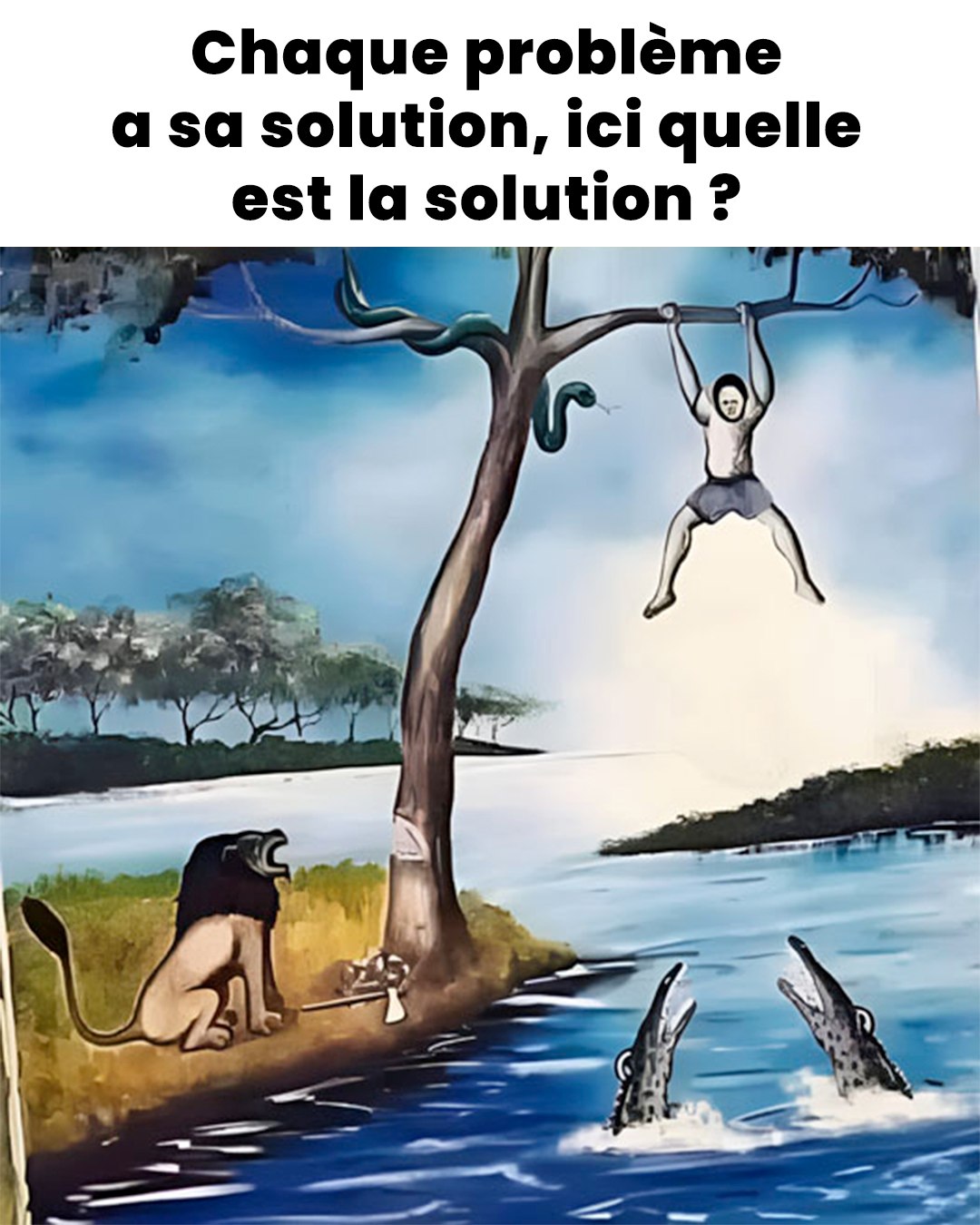 Imaginez un homme pris au piège, devant plusieurs choix dangereux : un serpent à droite, un arbre qui menace de tomber dans l’eau à gauche, un lion qui l’attend si le sol est franchi, et des crocodiles dans l’eau. Le problème semble insurmontable, n’est-ce pas ? Pourtant, il existe une solution aussi inattendue qu’astucieuse. L’homme doit simplement attendre que le lion descende au lac pour boire, ce qui écartera les crocodiles. C’est ce moment que l’homme doit saisir pour s’échapper en toute discrétion. La solution réside dans l’observation et la patience.