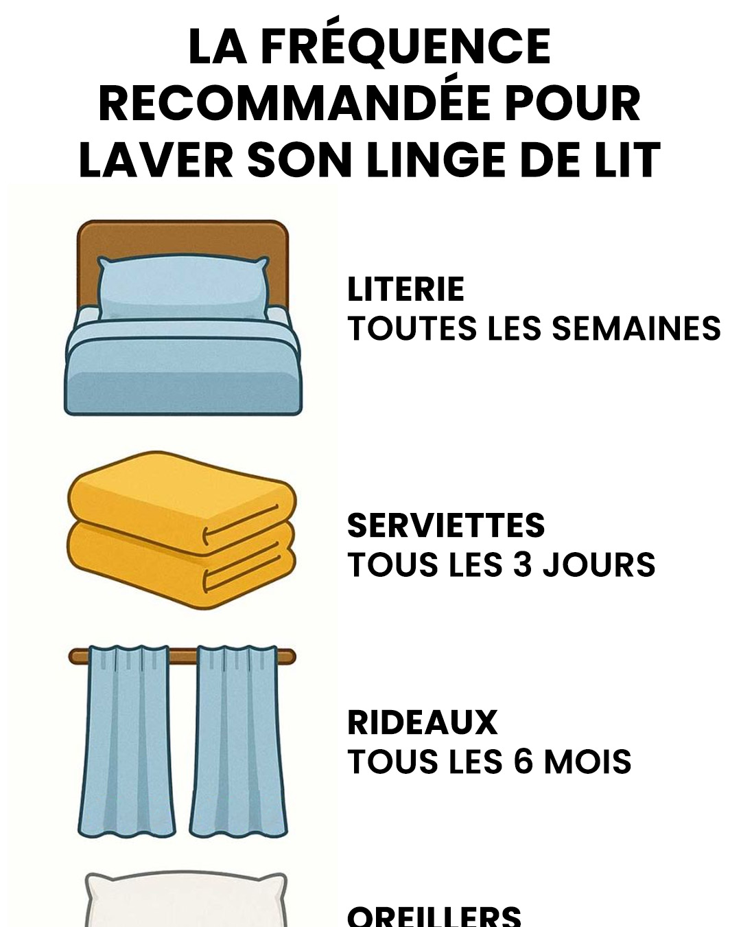 Nos draps, housses et taies d’oreiller accumulent chaque nuit sueur, cellules mortes et sébum. Un terrain idéal pour les acariens et autres allergènes. Pour maintenir une hygiène optimale et favoriser un sommeil réparateur, un lavage hebdomadaire à 60 °C est fortement recommandé. - Serviettes de bain : tous les 3 jours