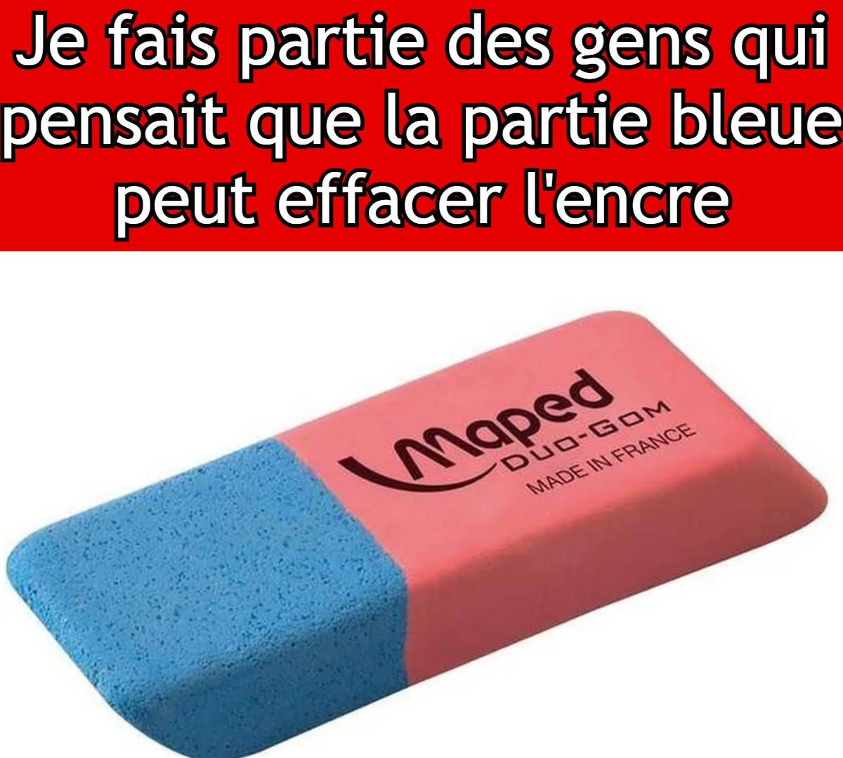 Relayé par nos confrères de CNews, le rôle de la partie bleue de cette gomme lève enfin le voile sur toutes nos interrogations. Et pour cause, les intrépides qui l’ont essayé ont déchiré leur feuille. Non, cette moitié bleutée n’efface pas du tout l’encre de stylo, contrairement à ce que tout le monde pense.