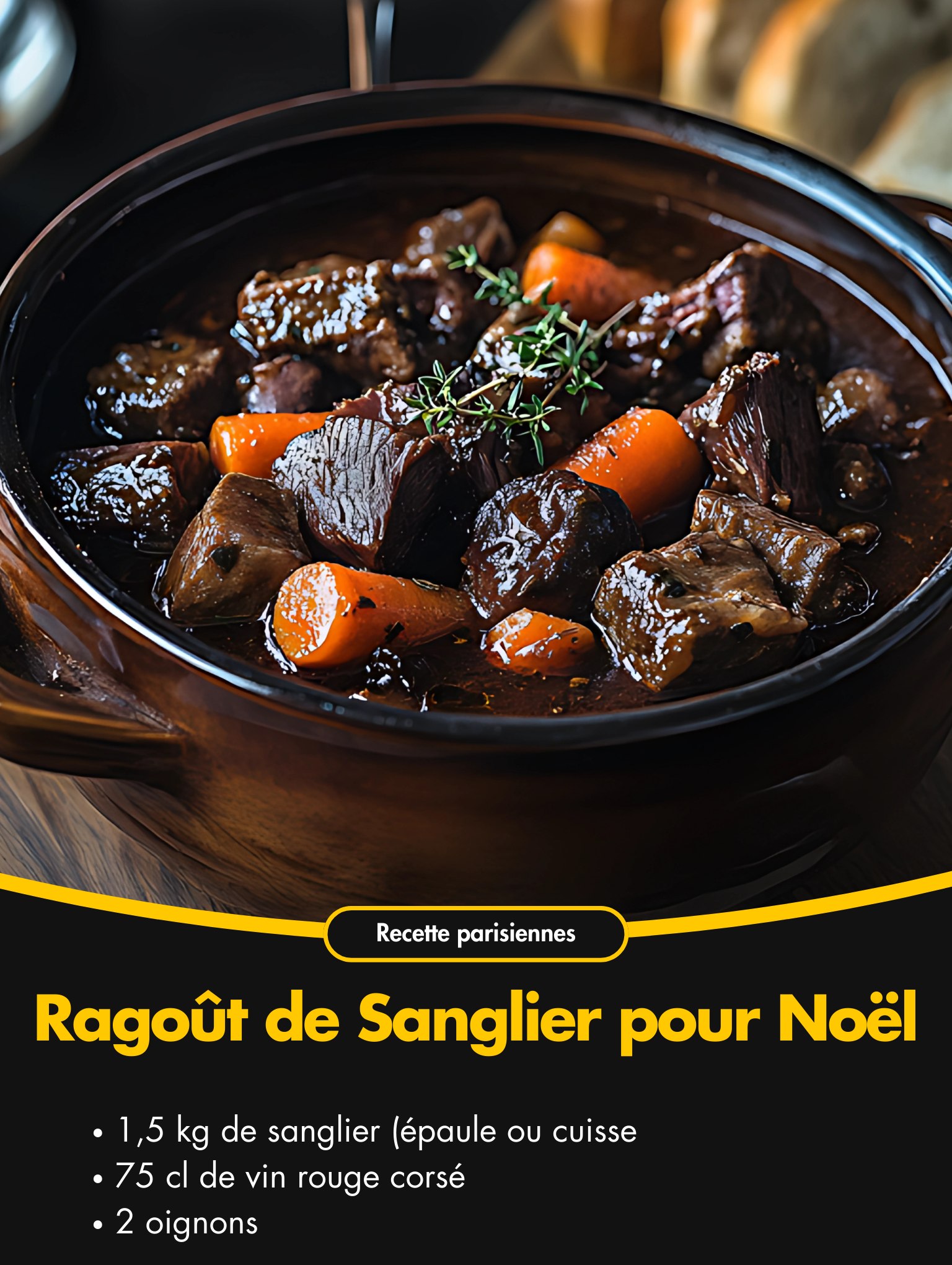 Ingrédients :1,5 kg de sanglier (épaule ou cuisse), coupé en gros cubes75 cl de vin rouge corsé2 oignons3 carottes2 gousses d’ail1 bouquet garni (thym, laurier, romarin)50 cl de bouillon de volaille2 c. à soupe de farine4 c. à soupe d’huile d’olive200 g de lardons fumésSel, poivreHerbes de ProvencePréparation : lire la suite page suivante