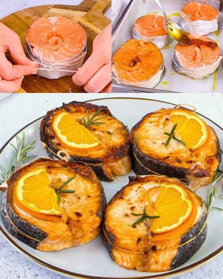 INGRÉDIENTS 4 escalopes de saumon 1/2 orange (jus) 10 g (1/2 cuillère à soupe) de miel 35g (2 cuillères à soupe) sauce de soja Huile d’olive en flocons de piment Tranches d’oranges romarin Versez la sauce : la suite dans la page suivante