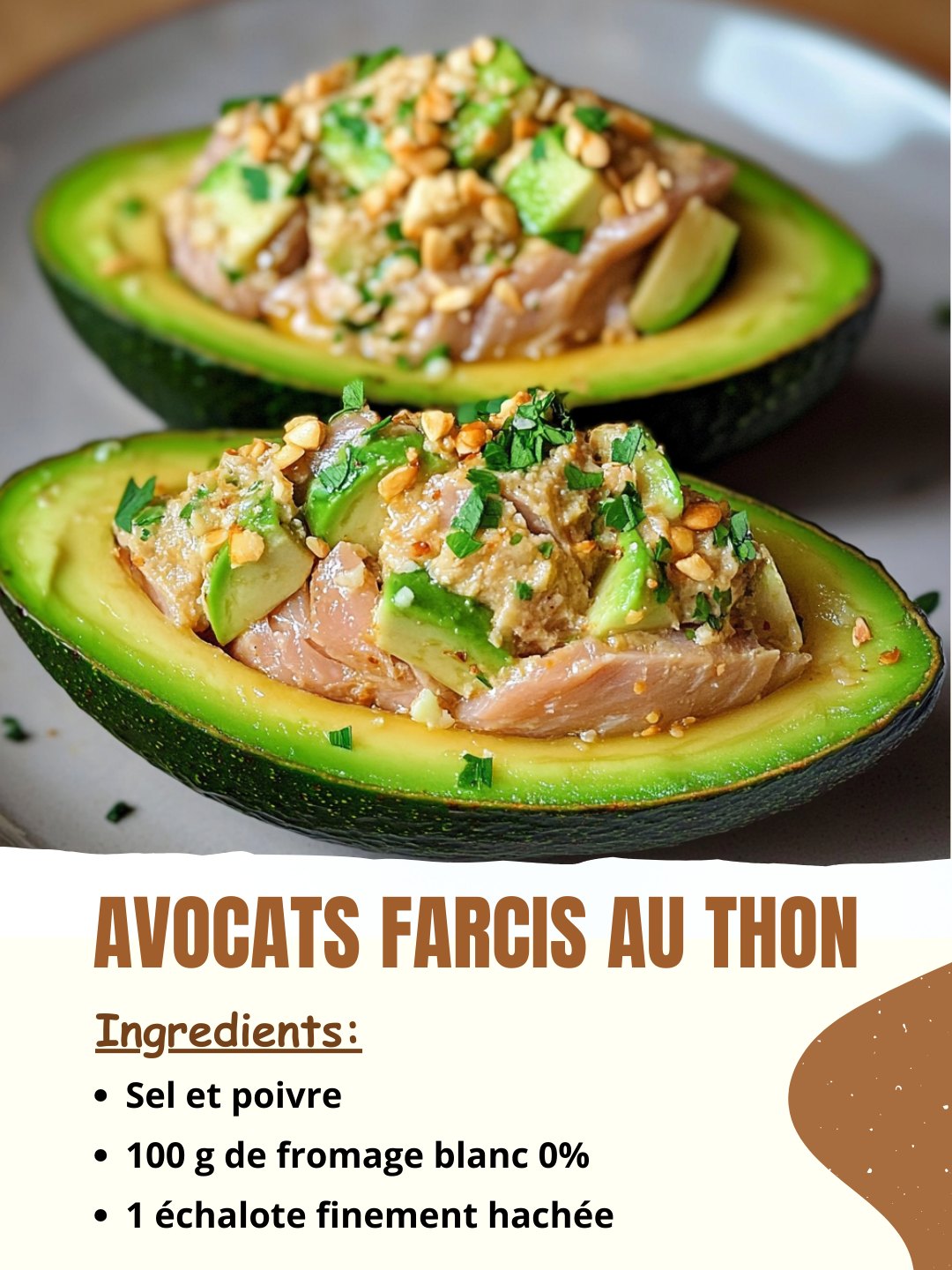 Avocats farcis au thon Ingrédients : Sel et poivre 100 g de fromage blanc 0% 1 échalote finement hachée