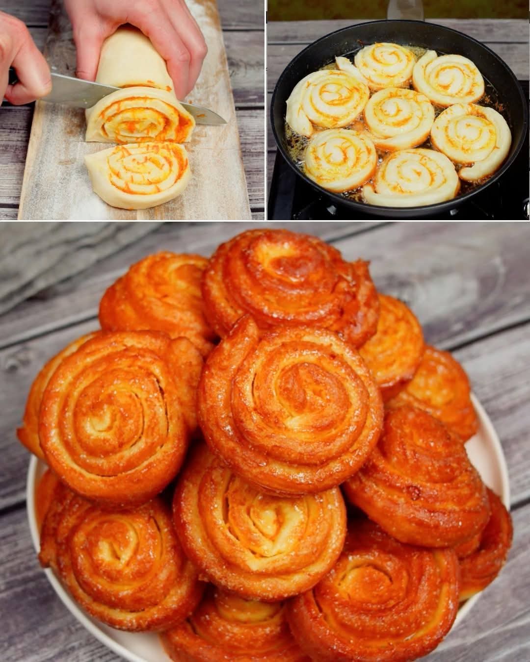 Contrairement aux beignets classiques, ceux-ci sont roulés comme des petits pains à la cannelle, puis découpés en tranches avant d’être frits. À la cuisson, ils gonflent et prennent une forme spiralée irrésistible. On les saupoudre ensuite de sucre glace, ou on les roule encore tièdes dans du sucre vanillé.