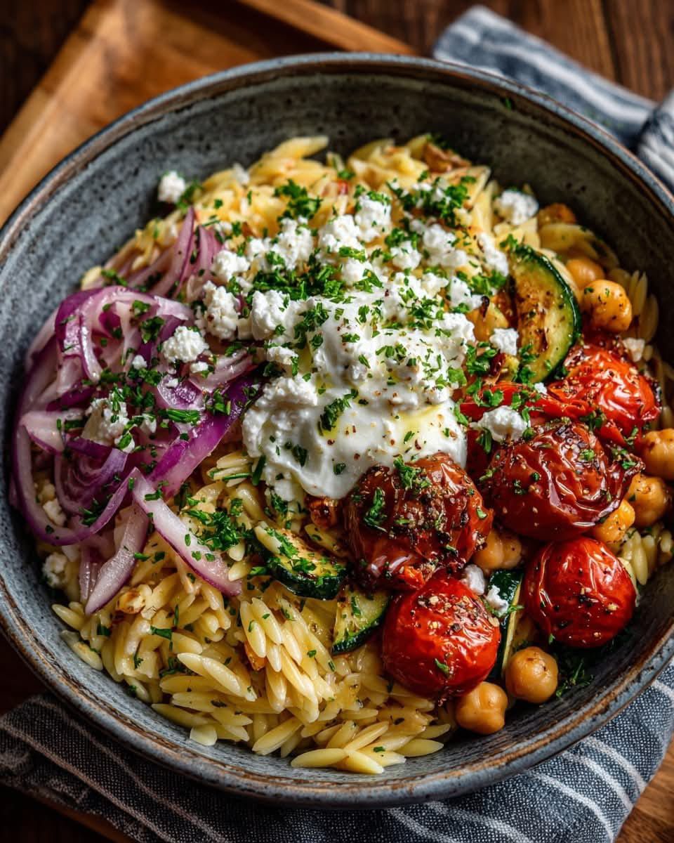 Ce bol sain combine des pâtes orzo moelleuses, des légumes rôtis, des pois chiches riches en protéines et du fromage feta crémeux. Mélangé à une vinaigrette au citron et aux herbes, il est léger mais copieux – parfait pour le déjeuner, la préparation de repas ou un dîner coloré.