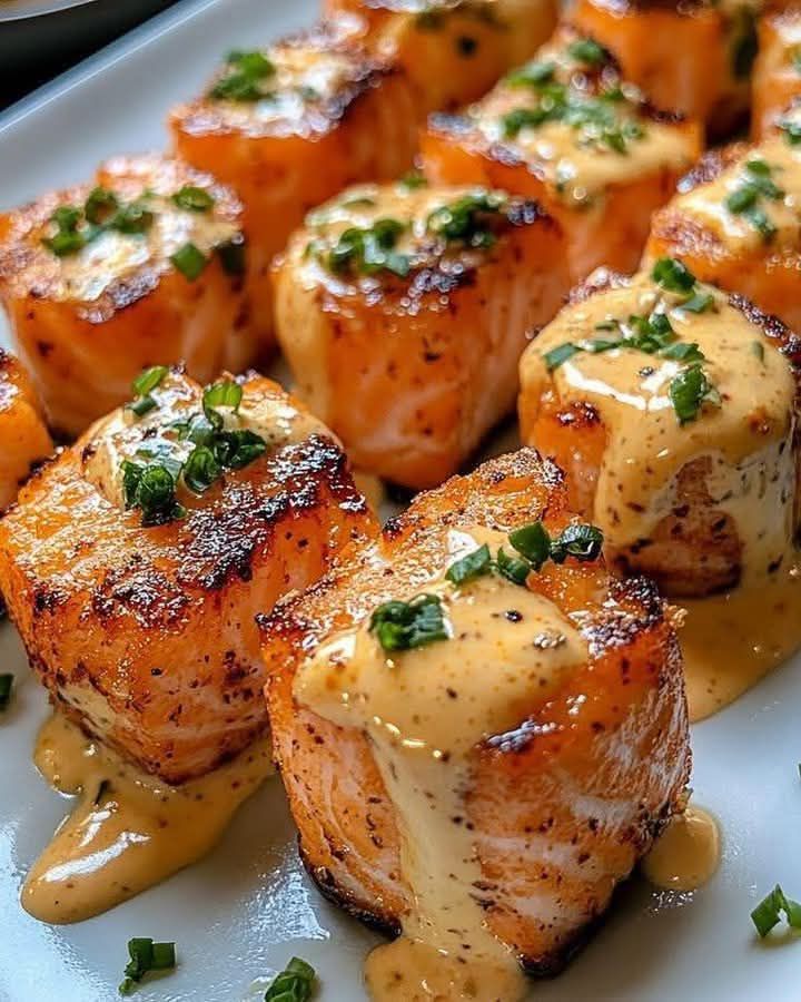 – 1 lb de filet de saumon, peau enlevée, coupée en morceaux de bouchée