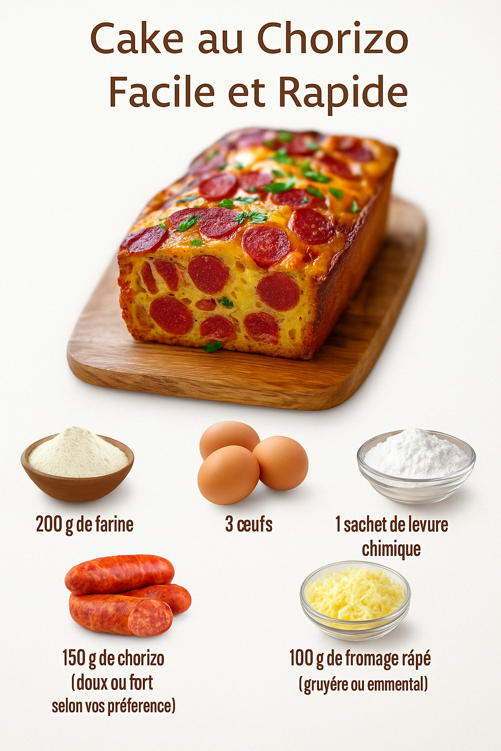 Un cake salé moelleux, idéal pour un apéritif entre amis ou un repas léger accompagné d’une salade. Le chorizo apporte une touche épicée irrésistible qui se marie à merveille avec le fromage fondu.