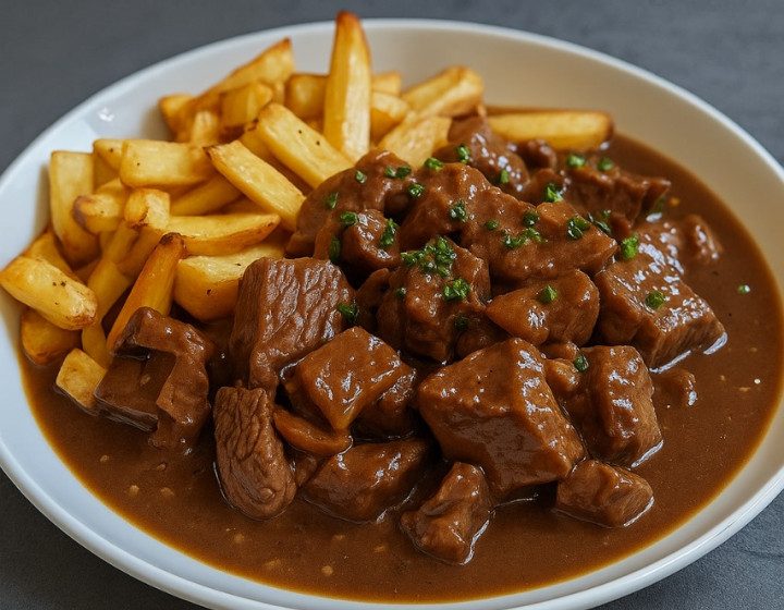 Un plat emblématique du nord de la France et de la Belgique : un ragoût de bœuf mijoté à la bière brune, servi avec des frites croustillantes 🍺🍟