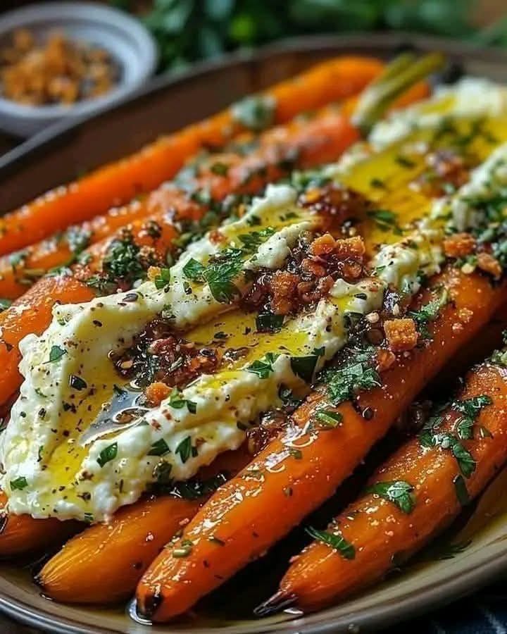 Carottes rôties avec ricotta fouettée et miel chaud