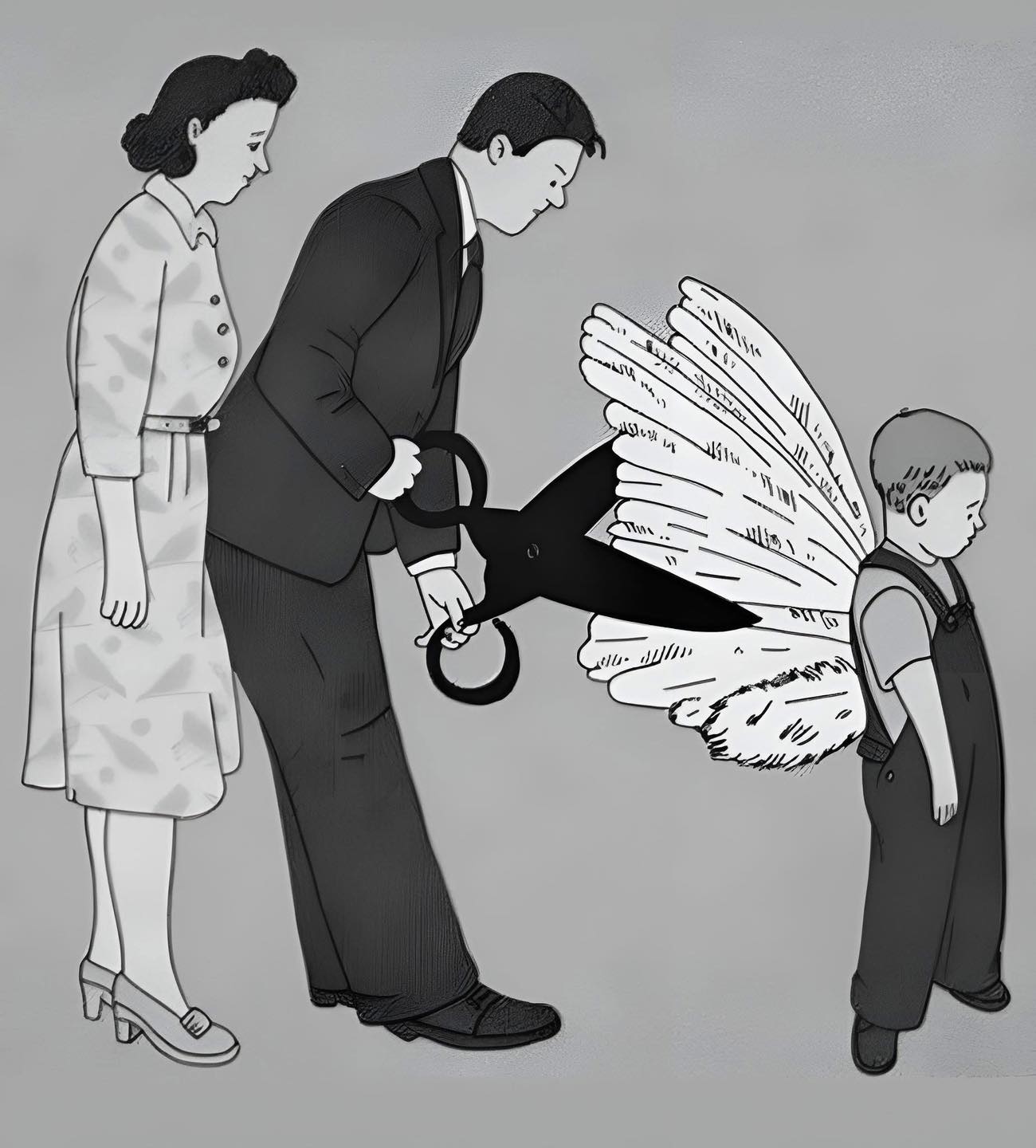 Sur cette illustration, le père coupe les ailes de son propre enfant pendant que la mère observe, impuissante ou résignée.
