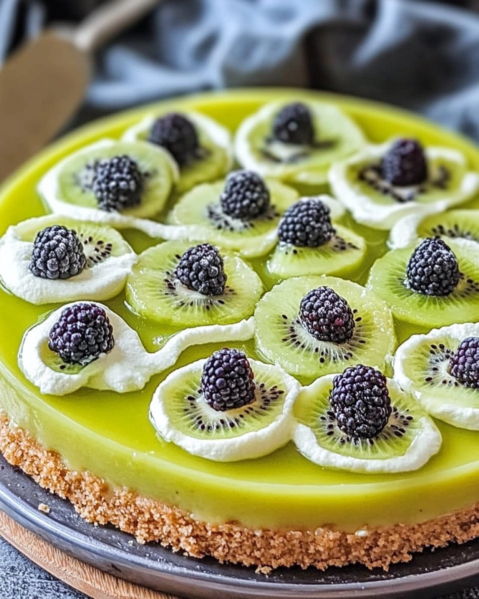 Ce cheesecake au kiwi végétalien sans cuisson est une version plus saine du classique. Avec une purée de kiwi frais incorporée dans une base de soja crémeuse et garnie d’une gelée acidulée, c’est un dessert accrocheur qui est également léger, sans produits laitiers et délicieux. Pas besoin de four : il suffit de refroidir et de servir !