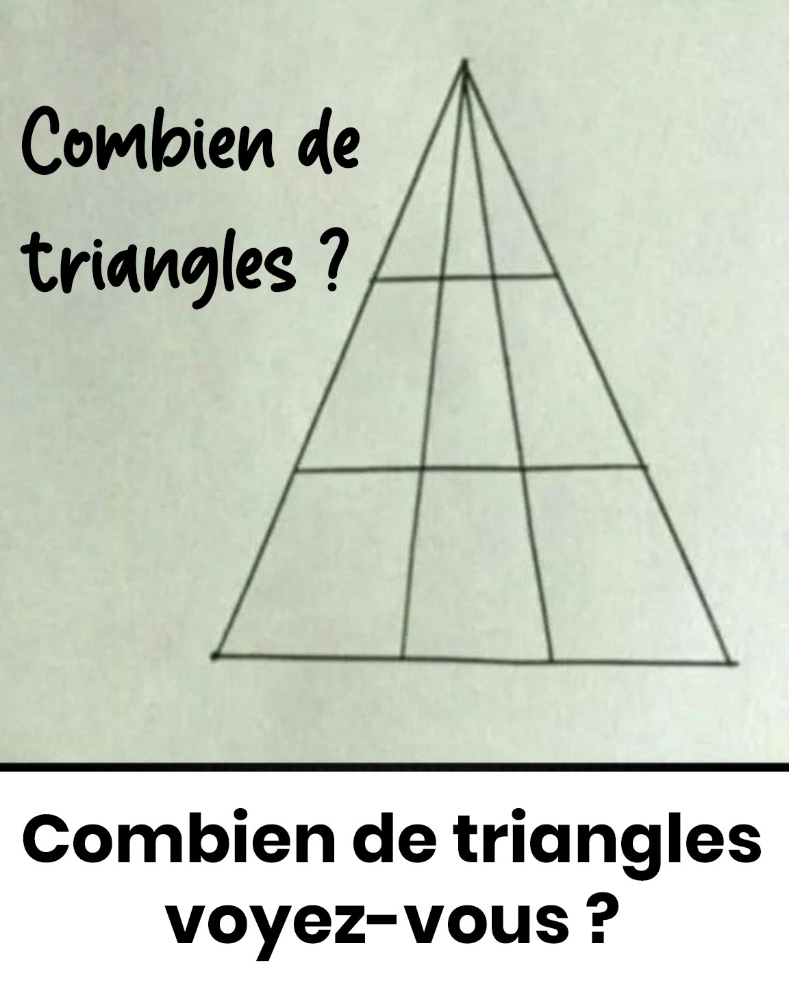 Notre cerveau adore repérer les petits triangles évidents et… oublier les grands qui se forment en combinant plusieurs zones. Résultat : on sous-estime. Dans la configuration classique (4 rangées formées par 3 lignes parallèles à la base), la bonne réponse est 27.