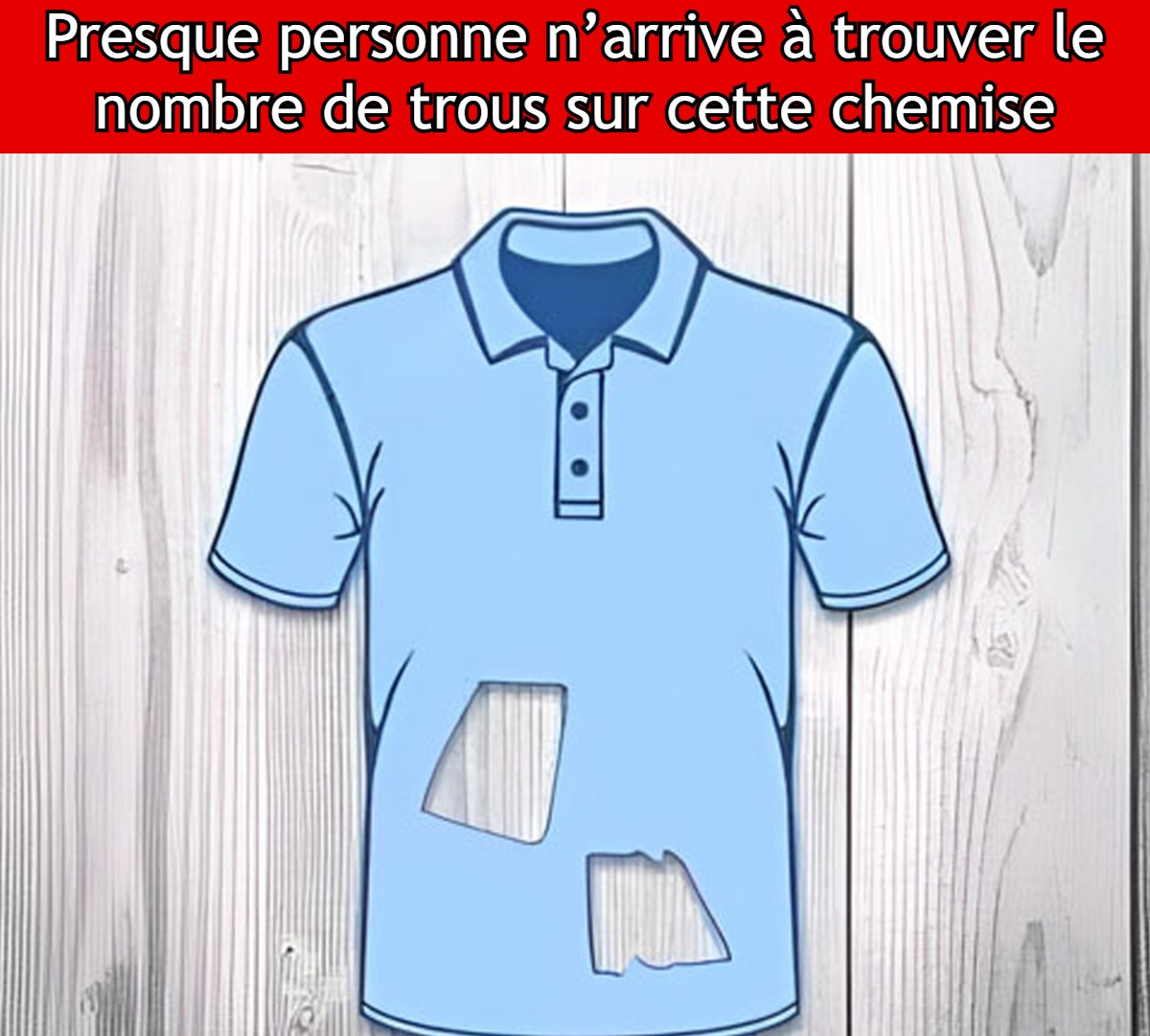 À première vue, tout semble parfaitement normal : une chemise classique, comme on en porte tous les jours. Pourtant, un détail intrigue, pousse à regarder de plus près, et même à douter de ce qu’on croyait acquis. Et si cette chemise cachait un secret méconnu ? Un détail visuel qui, mine de rien, met nos neurones au défi… Saurez-vous deviner combien de trous s’y trouvent vraiment ?