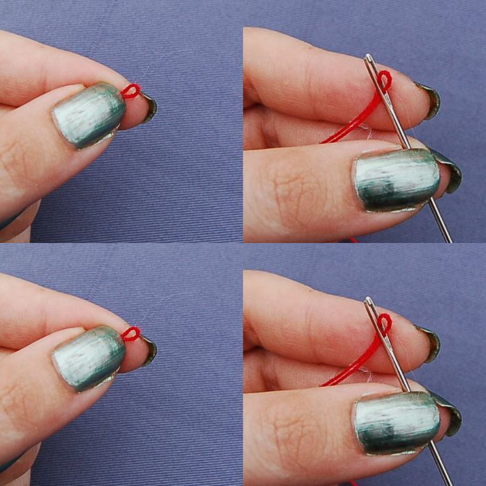 - Tenez l’aiguille à l’horizontale, chas vers le haut, et le fil juste en dessous.