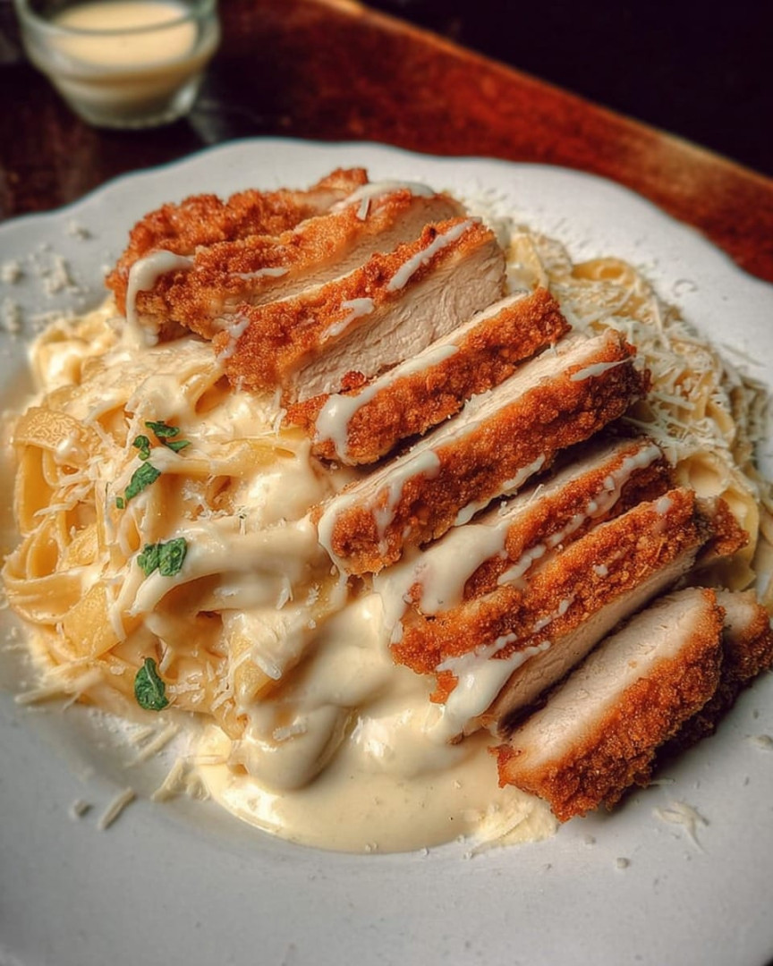La sauce Alfredo est une icône de la cuisine italienne-américaine : simple, onctueuse et pleine de saveurs. Lorsqu’elle est associée à des fettuccine parfaitement al dente et à du poulet pané croustillant, le résultat est tout simplement irrésistible.