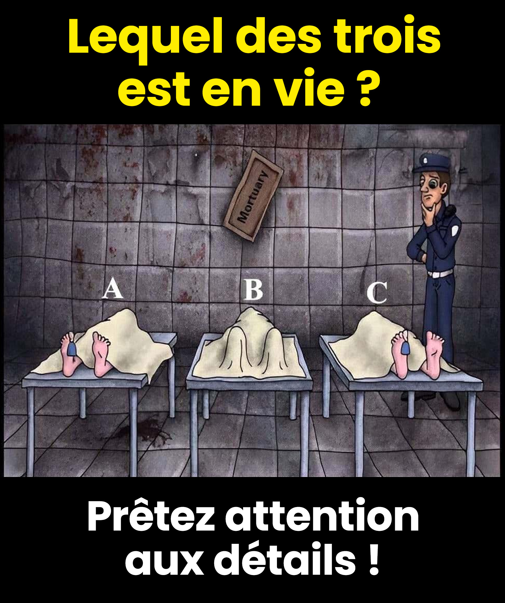 La personne A est la seule encore en vie. Pourquoi ? Un minuscule indice au sol, sous la table, trahit une activité… vivante. Cette petite trace n’a rien de dramatique : elle suggère simplement que la circulation fonctionne encore. En clair, il se passe quelque chose de discret mais réel, le genre de signal qui n’existe pas quand tout est totalement à l’arrêt. Notre intuition associe souvent ce type de marque à une mauvaise nouvelle ; ici, c’est l’inverse : c’est la preuve d’un organisme encore actif.