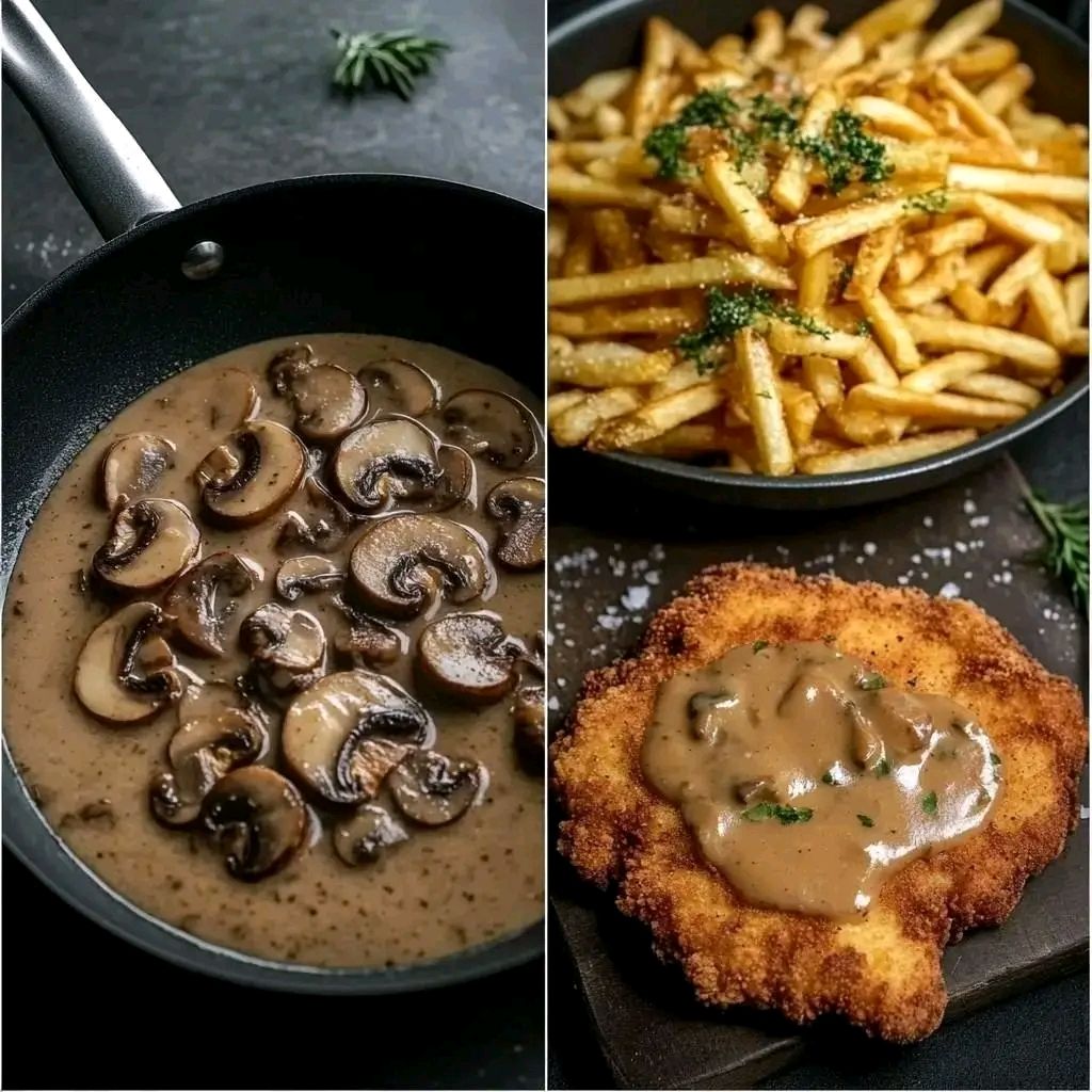 Escalope viennoise (schnitzel) avec sauce aux champignons et frites croustillantes :