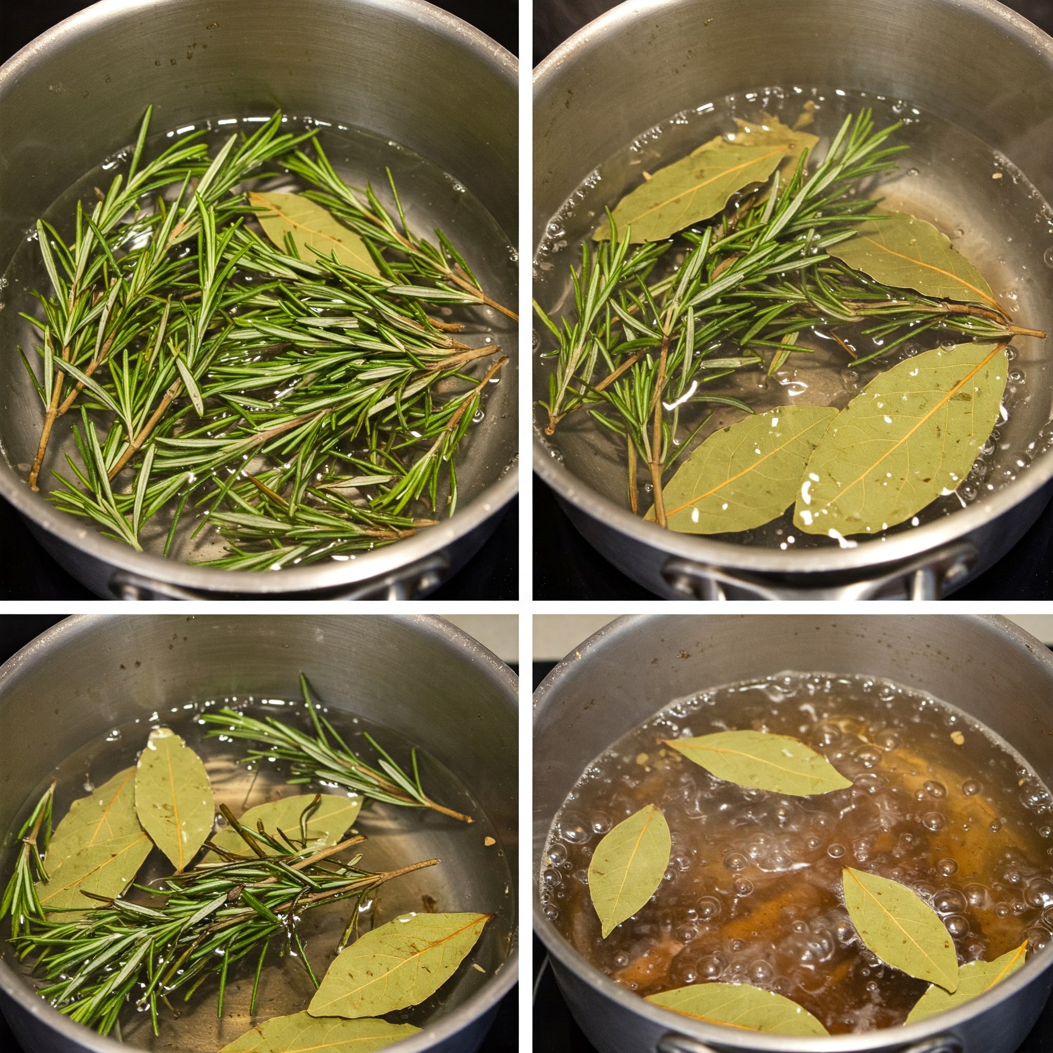 Porter les ingrédients à ébullition : Dans une casserole, ajouter les clous de girofle, les feuilles de laurier, le romarin et l’eau. Porter à ébullition à feu doux jusqu’à ce que l’eau devienne foncée.
