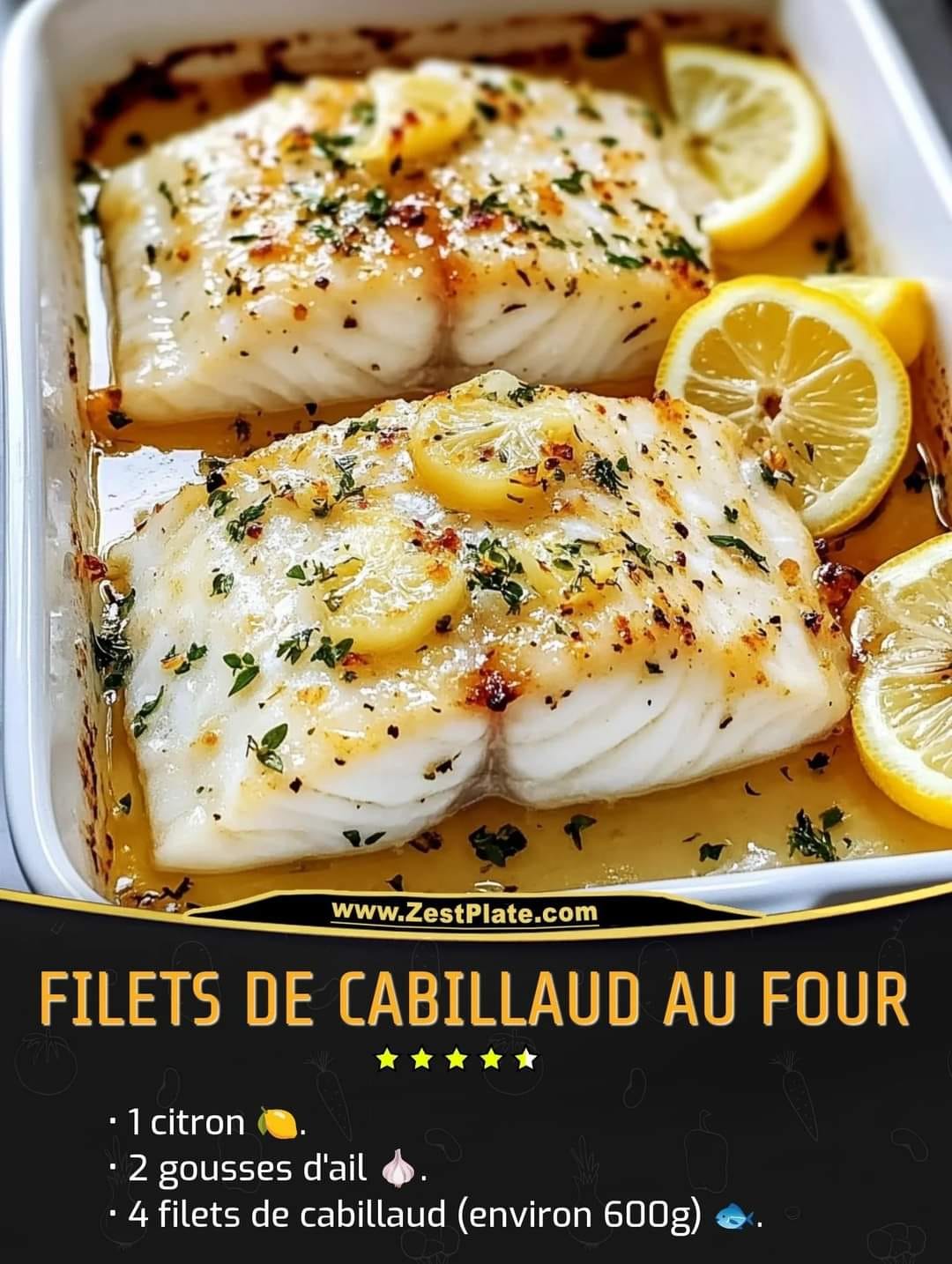 Ces filets de cabillaud cuits au four sont un plat sain et rapide à préparer. Le cabillaud, tendre et délicatement parfumé avec du citron et des herbes, est idéal pour un repas léger, accompagné de légumes ou d’une salade.