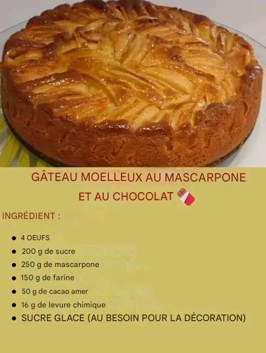 Ce gâteau moelleux au mascarpone et au chocolat est un dessert délicieux et simple à réaliser, parfait pour le petit-déjeuner ou le goûter. Préparé sans beurre ni huile, ce gâteau est moelleux et riche en saveurs grâce au mascarpone. Voici comment le préparer !