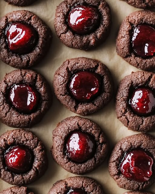 Ces biscuits au chocolat et aux cerises se marient parfaitement avec une boule de glace à la vanille ou une cuillerée de crème fouettée. Pour un accord plus sophistiqué, servez-les avec un verre de porto ou un café riche et noir. Ils constituent également un bel ajout à un plateau de desserts, complété par des baies fraîches et une sélection de fromages.
