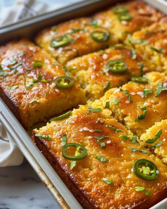 Ce pain de maïs au piment jalapeño se marie parfaitement avec des plats principaux copieux comme le chili, les viandes grillées ou les légumes rôtis. Il complète également les soupes et les ragoûts, ajoutant un peu de chaleur et de douceur pour équilibrer les saveurs riches. Pour un repas complet d’inspiration sudiste, servez-le avec du chou vert et de la salade de chou acidulée.
