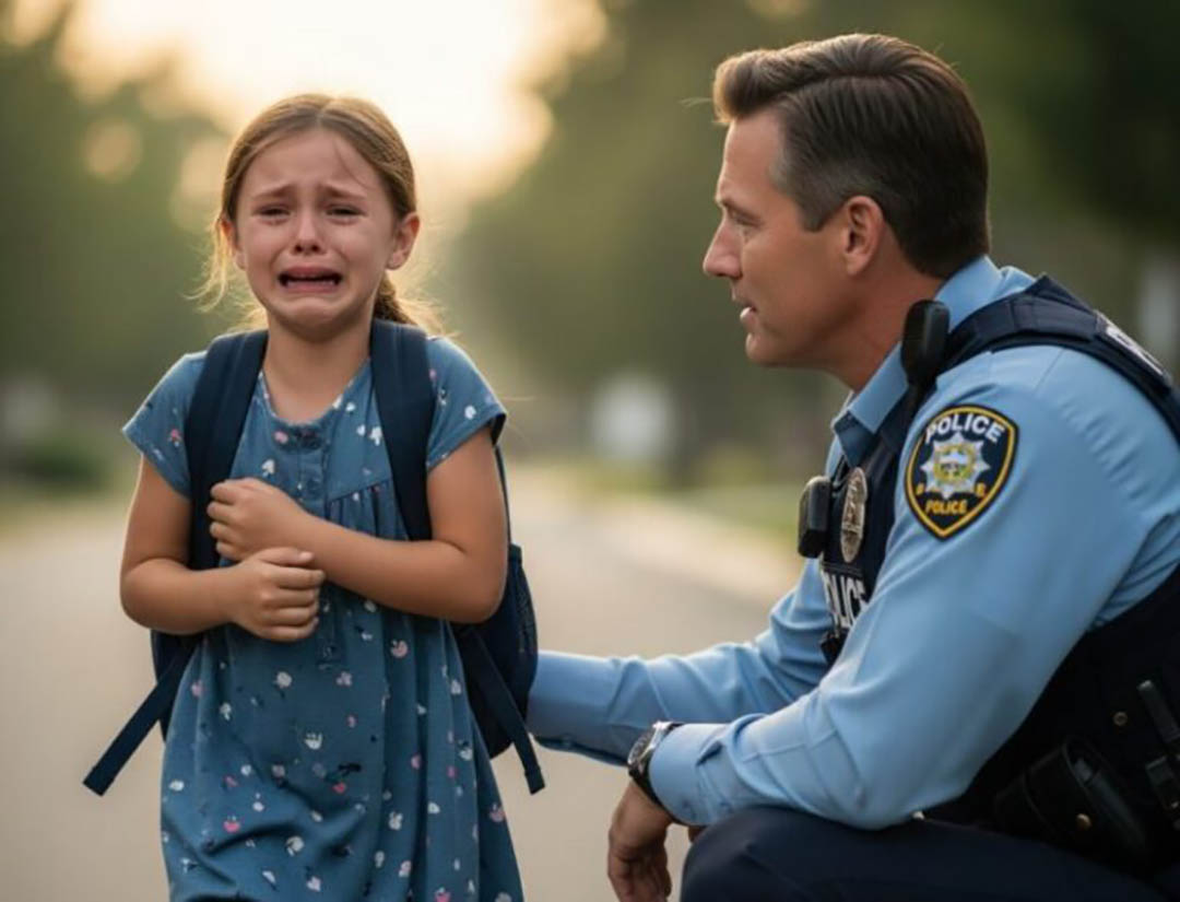 Quelques rues plus loin, elle aperçoit enfin deux policiers en patrouille. Sans hésiter, elle fonce droit vers eux. Le sergent remarque immédiatement son état : cette enfant, seule et en détresse, n’est pas là par hasard. Il s’approche avec précaution, mais la fillette éclate en sanglots et s’accroche à lui.