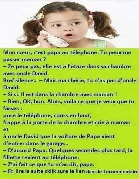 Un homme cherche à parler à sa femme (1/14) Un homme voulait à tout prix parler à sa femme pour lui demander quelque chose. Ce dernier ne se trouvait pas chez lui. Il a alors pris son téléphone puis a composé un numéro pour joindre son épouse. Une petite fille répond (2/14) Au bout de quelques secondes, … Read more