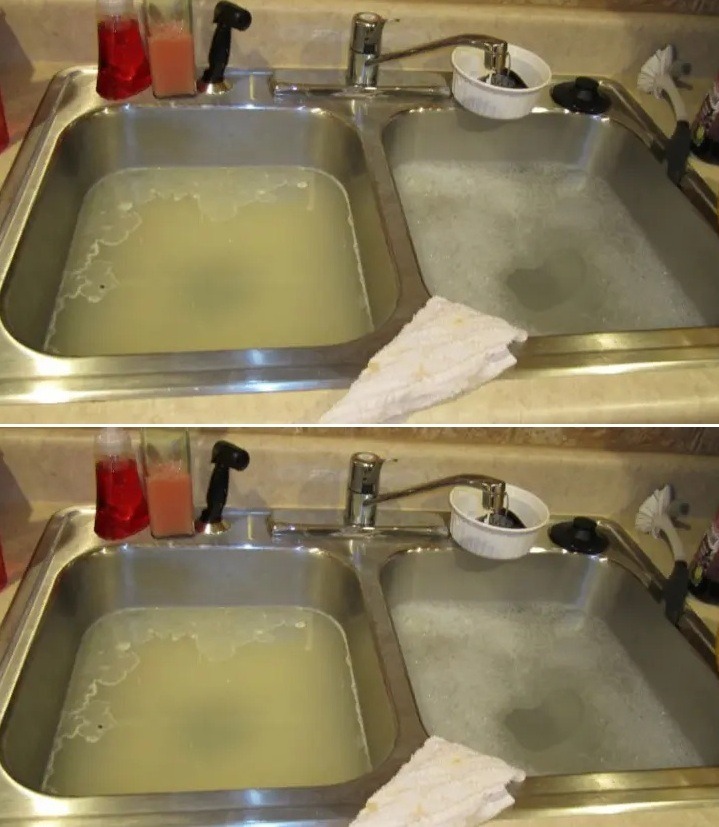Le détergent décompose les graisses et l’eau bouillante aide à détacher les accumulations et à les déplacer dans les tuyaux.