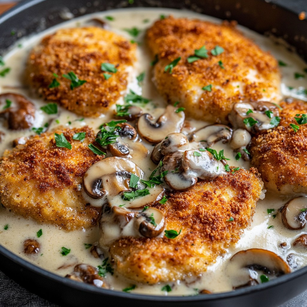 Poulet doré croustillant à la sauce parmesan et champignons