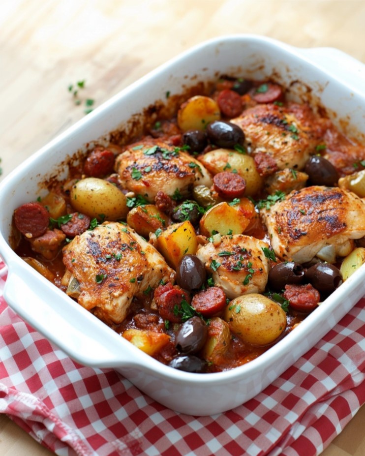 Le poulet sauté au chorizo est une recette riche en saveurs, parfaite pour un repas convivial en famille ou entre amis. L’association du poulet doré, du chorizo épicé et des pommes de terre fondantes crée un plat réconfortant et généreux. Grâce aux tomates et aux épices, la sauce est parfumée et légèrement relevée, pour un équilibre parfait entre douceur et piquant. Ce plat mijoté se déguste aussi bien en hiver qu’en toute saison, accompagné d’un bon pain pour savourer la sauce.