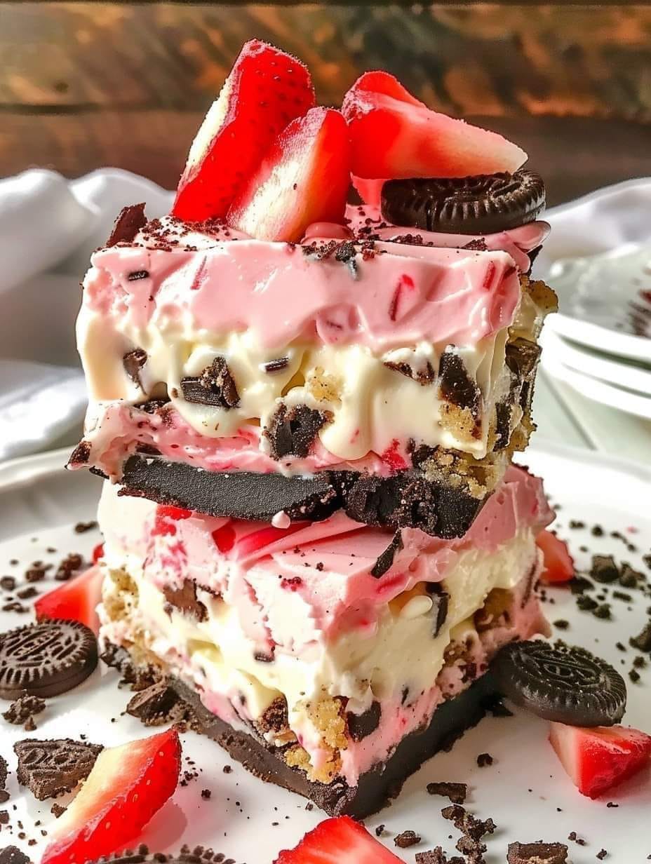 – 1 tasse de biscuits Oreo écrasés – 2 bananes mûres écrasées – 8 oz de fromage à la crème ramolli – 1/2 tasse de sucre en poudre – 1 cuillère à café d’extrait de vanille – 1/2 tasse de crème fouettée – Sirop de chocolat, pour arroser – Cerises au marasquin, pour la garniture Instructions :