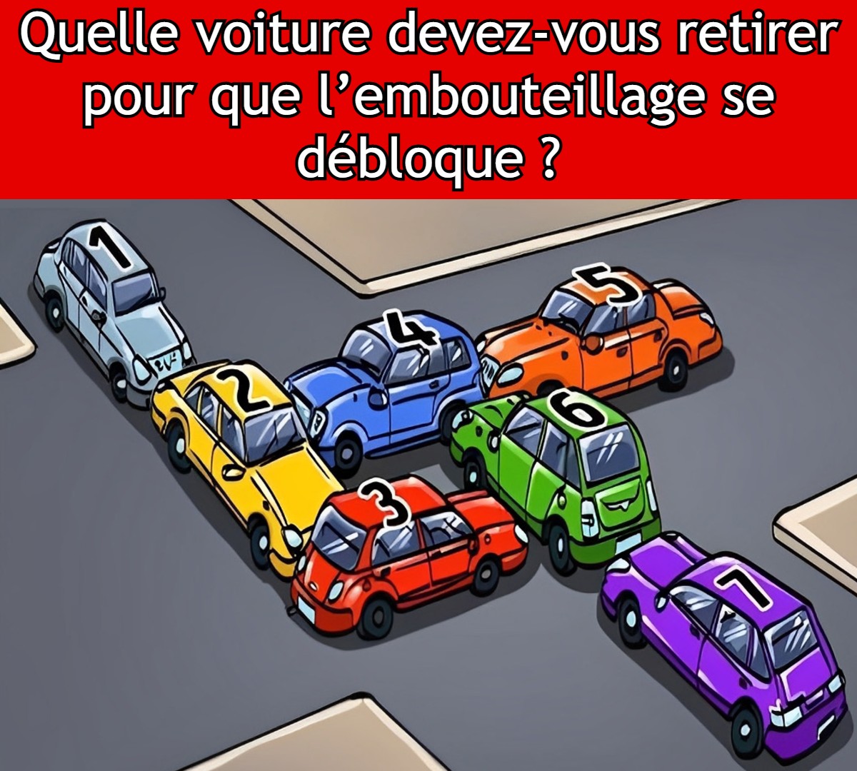 Voici une petite énigme visuelle qui fait appel à votre sens de l’observation et à votre logique. L’objectif est simple (en apparence) : identifier la voiture qu’il faut déplacer pour débloquer toute la circulation.