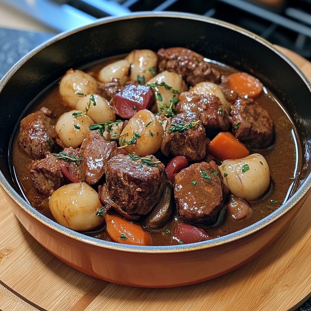 Il existe peu de plats aussi emblématiques de la cuisine française que le ragoût de bœuf mijoté longuement dans une sauce riche et onctueuse. Cette version, à base de paleron fondant, de champignons sautés, de bacon croustillant et d’un bouillon parfumé au bouquet garni, incarne tout ce que l’on aime dans la gastronomie de terroir : la lenteur, la profondeur des arômes, et un vrai goût d’authenticité.