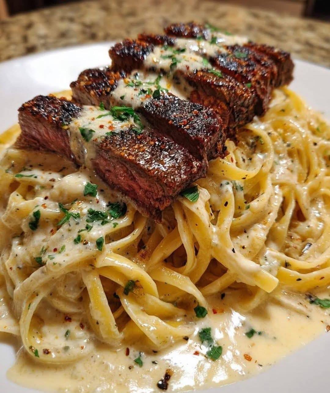 Recette de steak au beurre à l’ail cajun sur linguine crémeuse au parmesan comme suit