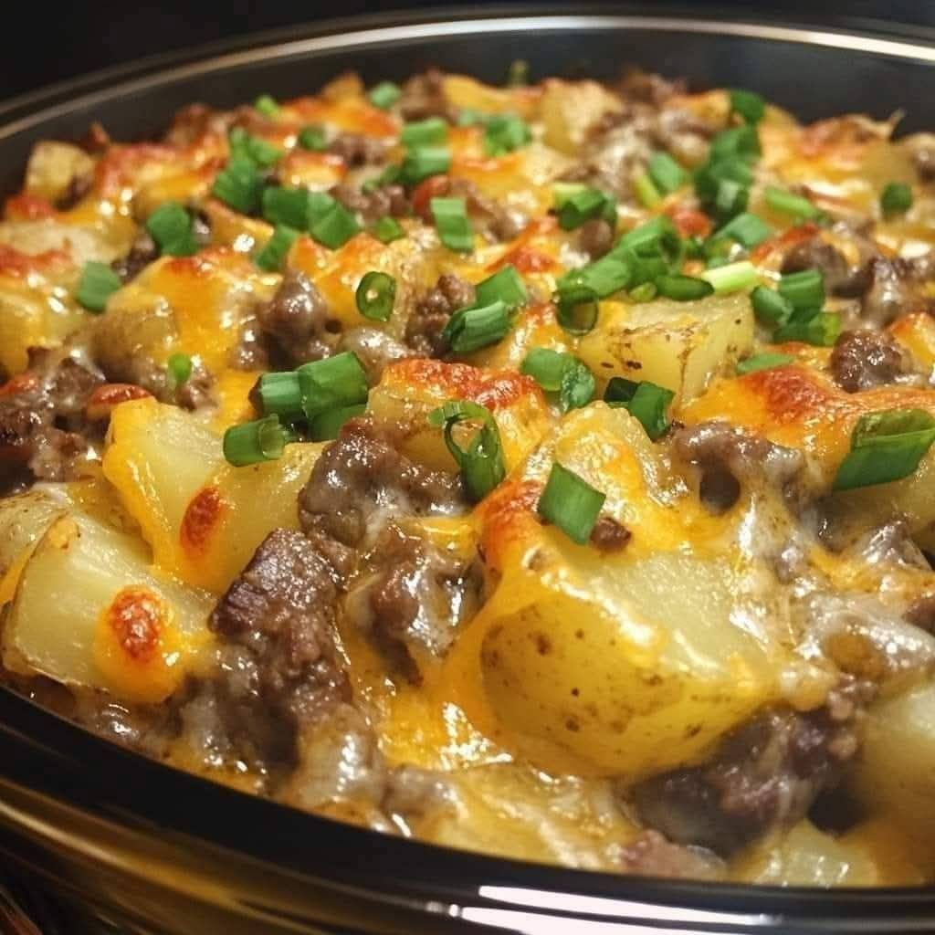 Cette cocotte de pommes de terre au fromage et au mijoteur est le plat réconfortant par excellence, combinant du bœuf tendre, des pommes de terre au fromage et des légumes savoureux. Parfait pour les journées chargées, c’est un repas facile à préparer en une seule casserole qui cuit lentement à la perfection. Le riche mélange de bouillon de bœuf, de sauce Worcestershire et de provolone fondu crée un plat irrésistiblement crémeux et savoureux. Servez-le chaud pour un dîner en famille ou une soirée douillette. Simple, copieux et absolument délicieux ! Ingrédients : 1 lb de bœuf finement tranché (surlonge ou faux-filet) 1 oignon moyen, finement tranché 1 poivron vert, finement tranché 2 tasses de pommes de terre rissolées surgelées ou de pommes de terre en dés 1 tasse de fromage provolone râpé (ou votre préféré) 1 tasse de bouillon de bœuf 2 cuillères à soupe de sauce Worcestershire 1 cuillère à café de poudre d’ail Sel et poivre au goût Persil frais pour la garniture (facultatif) Instructions : 1. Préparez les ingrédients : coupez le bœuf, l’oignon et le poivron en tranches pour faciliter la superposition. 2. Superposez la cocotte :