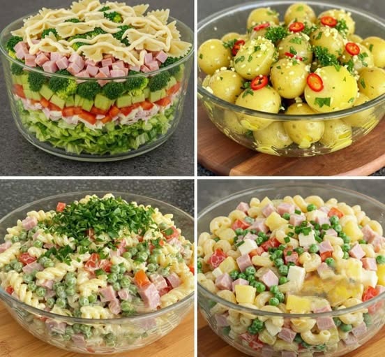 2. Dans un saladier transparent, disposer les pâtes en couches dans l’ordre suivant : laitue, surimi, poivron, concombre, brocoli, jambon cuit et pâtes.