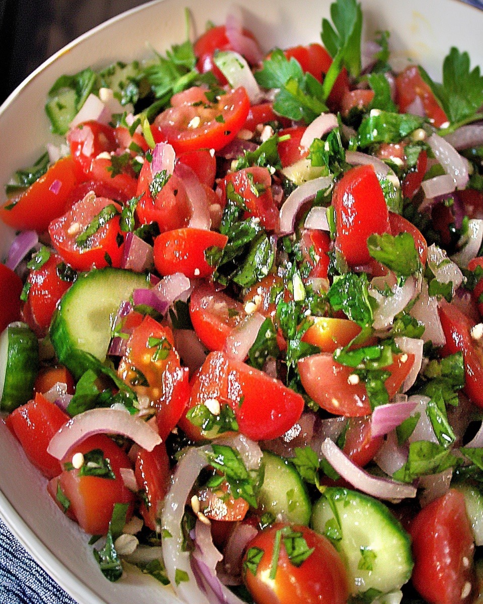 Cette salade est une explosion de fraîcheur avec ses tomates juteuses, son herbe aromatique typique et sa touche d’huile d’olive. Elle est parfaite en entrée légère, en accompagnement d’un barbecue ou même en repas léger avec un bon pain frais.