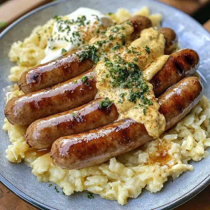 🍽️ Saucisses Grillées avec Moutarde au Miel, Spaetzle Beurrés et Chou Pointu Crémeux : un classique réconfortant à partager