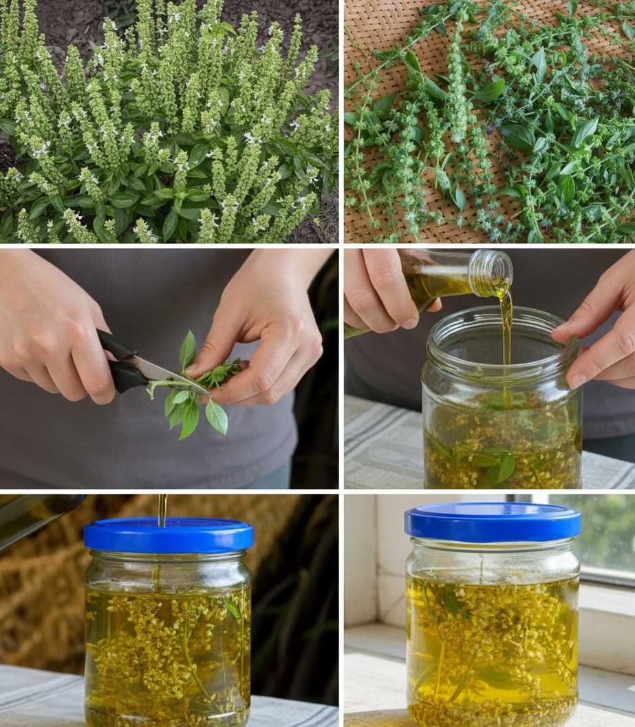 Les fleurs de basilic séchées permettent de créer un vinaigre délicatement parfumé, parfait pour les salades estivales ou les marinades.