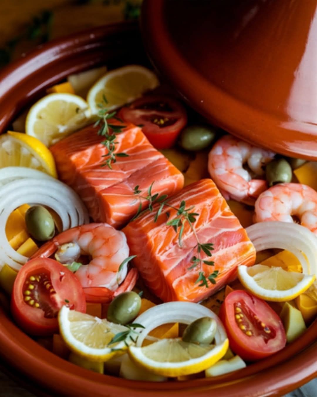 🍲🌿 Tajine de Saumon et Crevettes aux Légumes Méditerranéens : Une Recette Pleine de Couleurs et de Saveurs ✨