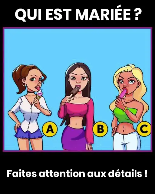 Elles sont trois, élégantes, sereines, en train de savourer une glace sous le soleil. Trois femmes stylées qui semblent profiter d’un doux moment. À première vue, tout paraît simple. Et pourtant, une question vient troubler ce tableau glacé : laquelle est mariée ? Pas d’interrogatoire, pas de discussion, juste une image et vos yeux pour vous guider. Prête à relever le défi ?