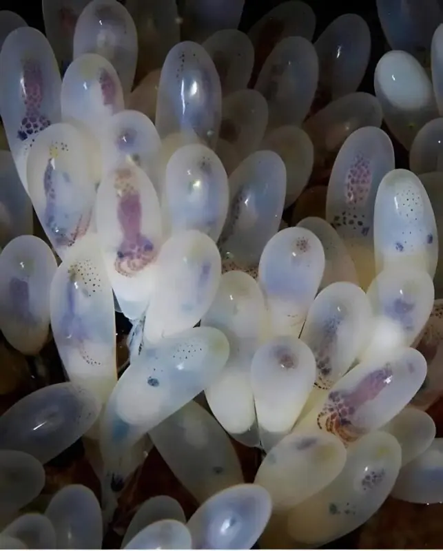 Clara , la pieuvre, avait choisi cette grotte comme dernier refuge. Là, elle avait pondu des centaines d’œufs, collés avec soin à la roche. Elle les surveillait sans relâche, protégeant chaque coquille avec une attention constante . Sans manger, sans bouger davantage que nécessaire, elle consacrait tout ce qu’il lui restait à la survie de ses petits.