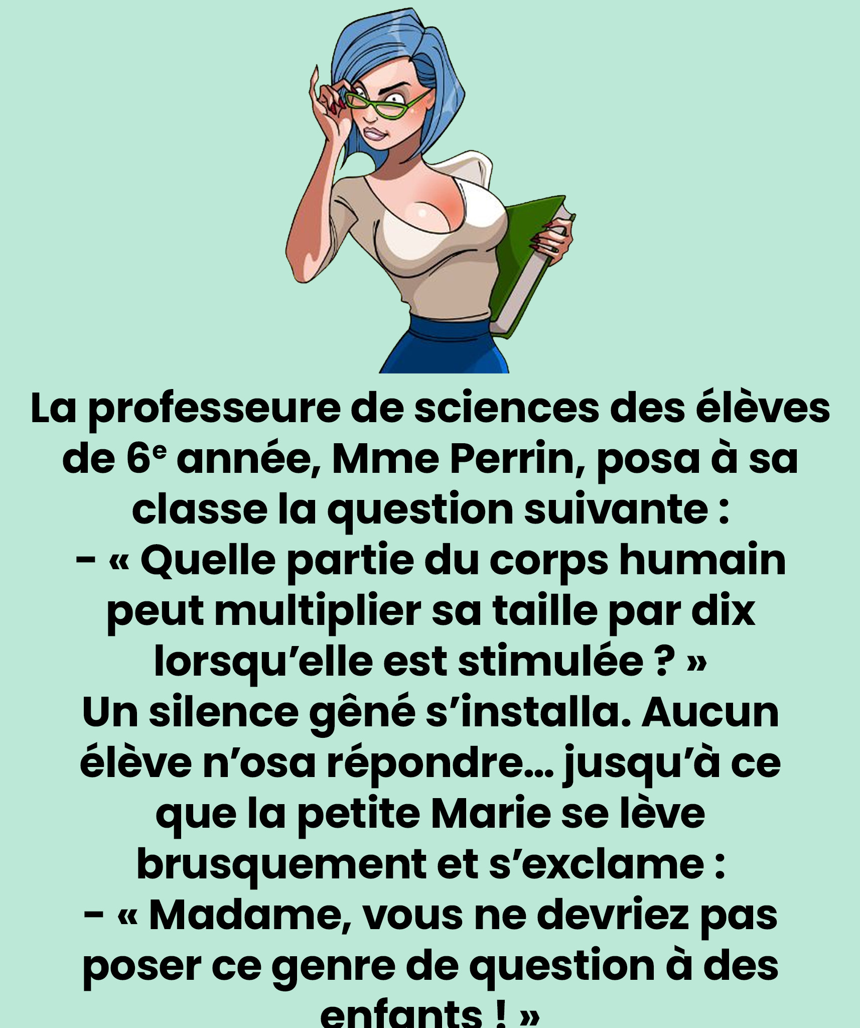 Stupeur dans la salle. Le malaise s’installe. Tous les yeux sont rivés sur Mme Perrin, dont le sourire reste intact. Sans se démonter, elle répète calmement la question. Un silence de plomb s’installe. Qui osera se risquer à répondre ?