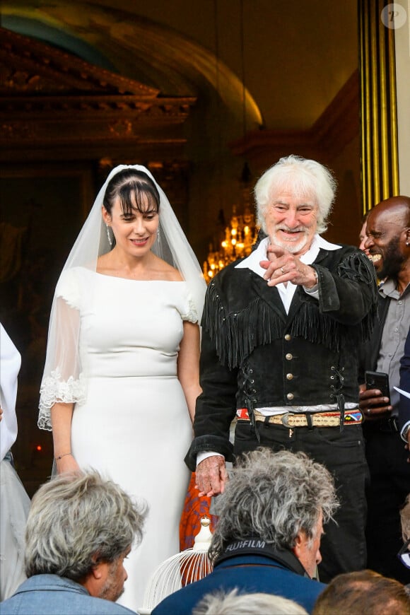 Agence / Bestimage – BestImageMurielle Mégevand et Hugues Aufray sur le parvis de l’église – Mariage d’Hugues Aufray et de Murielle Mégevand à l’église Saint-Vigor de Marly-Le Roy, France, le 2 septembre 2023.