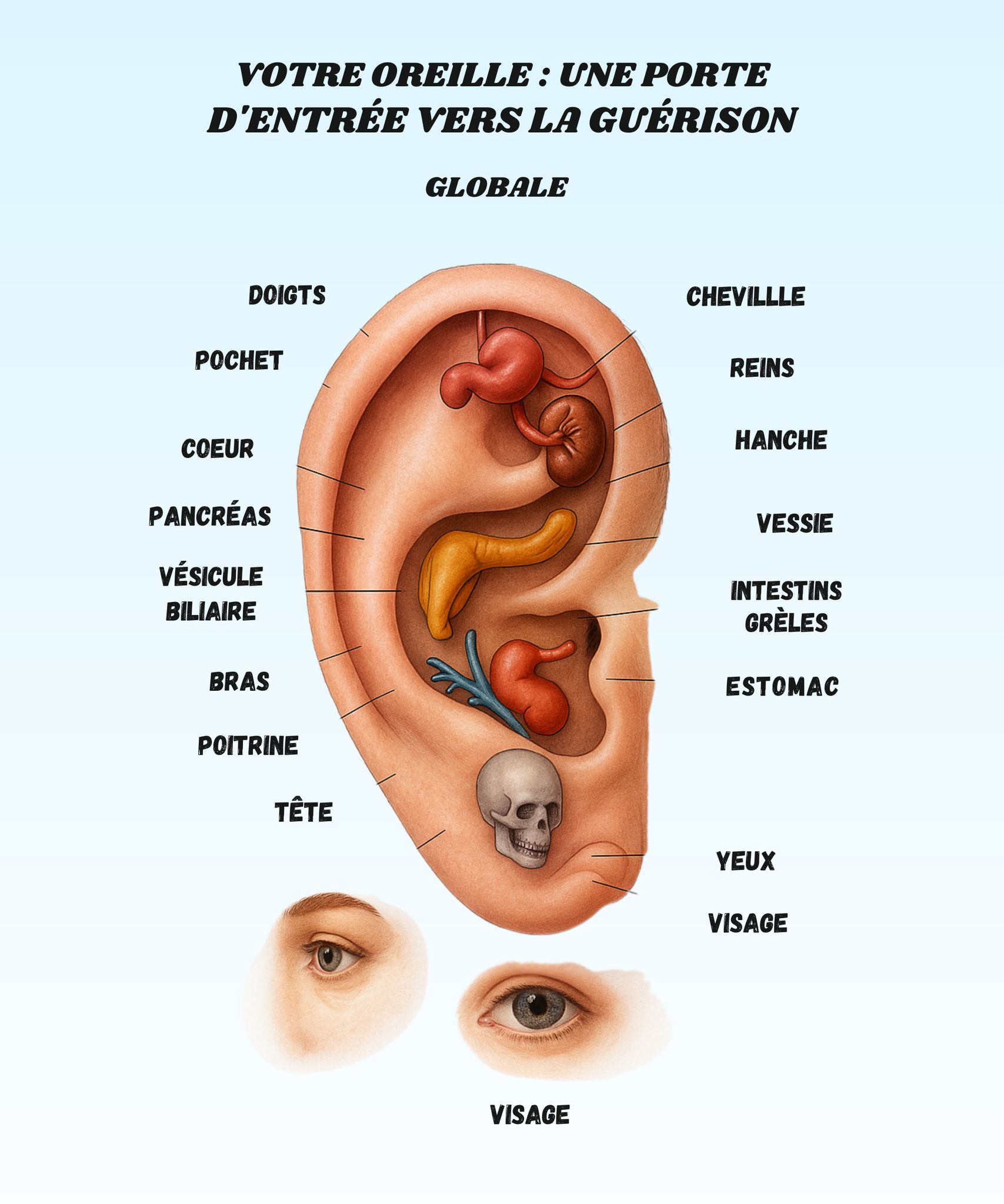 Votre oreille, une mini-carte du corps October 30, 2025 by Alpha.K ADVERTISEMENT Votre oreille, une mini-carte du corps En haut → les doigts et la main (parfait quand on abuse du clavier ou du téléphone et qu’on se plaint après d’avoir la main en béton). Sur le bord → le cœur et le pancréas (utile après un excès de chocolat ou une émotion forte). ADVERTISEMENT Next→ Leave a Comment Cancel replyCommentName Email Website Save my name, email, and website in this browser for the next time I comment.