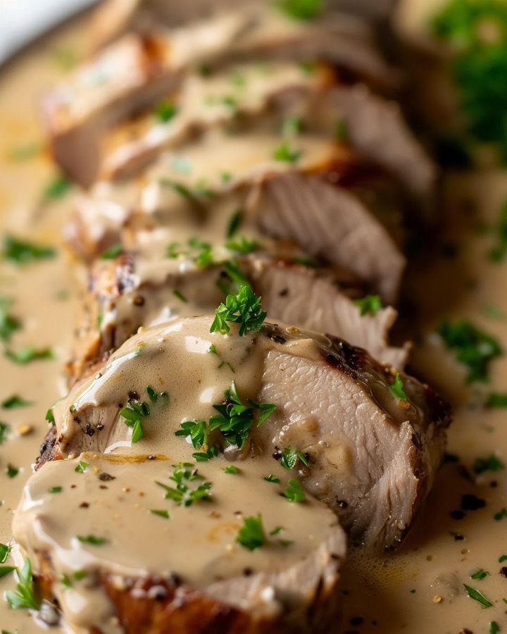 Traditionnellement, les plats de porc d’inspiration française sont plus susceptibles d’être servis avec des légumes racines ou un gratin de pommes de terre. Cependant, pour changer un peu, je sers souvent ce tendre filet de porc avec un lit de purée de chou-fleur à l’ail ou d’asperges rôties, ce qui non seulement complète l’onctuosité de la sauce mais ajoute également une touche d’élégance à la présentation. Sans aucun doute, une portion de pain croustillant ou de riz pilaf fera des merveilles pour absorber jusqu’à la dernière goutte de la sauce divine. Publicité